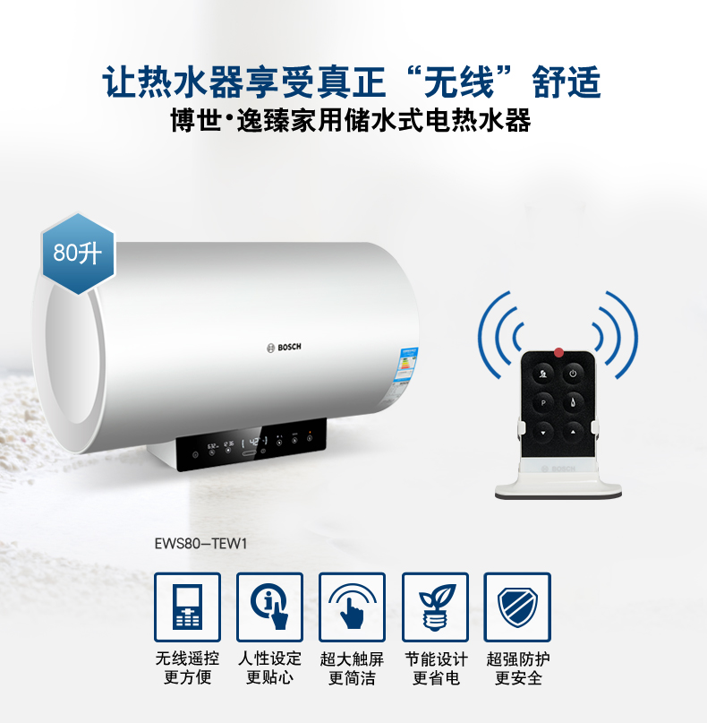 電子式控制,觸摸按鍵。無線遙控器??蛇x容積為50L/60L/80L/100L。
