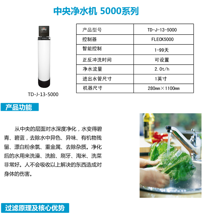 全屋中央凈水機(jī)有效去除水中的異色、異味;進(jìn)一步濾除水中微小雜質(zhì)、膠狀體;去除水中的漂白粉余氯、農(nóng)藥、重金屬;保留對(duì)人體有益的礦物質(zhì)。使水變得碧清、碧藍(lán),去除對(duì)人體有害的物質(zhì)。